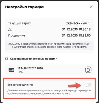 3) В всплывающем окне найдите блок «Сохраненные платежные профили». Найдите в самом низу ползунок «Без автопродления». Переведите его в активное положение - так автоматическое продление подписки будет остановлено.